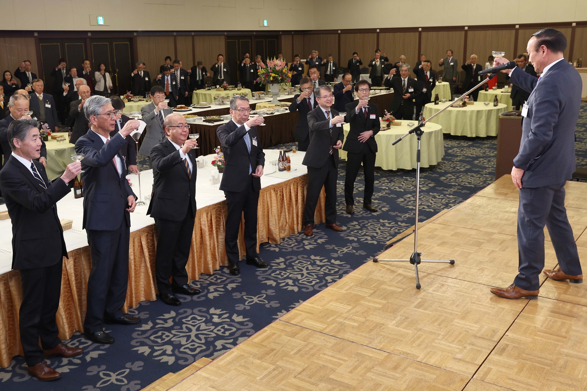 藤井富山市長(右)の発声で乾杯する出席者=ホテルグランテラス富山